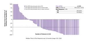 In the latest update of this study, pirtobrutinib demonstrated durable efficacy in the heavily pretreated group of MCL patients.31 The ORR was 49.3%, including a complete response (CR) rate of 15.8% and a partial response (PR) rate of 33.6%, in an expanded cohort of 152 patients (Figure 1). At a median follow-up of 15.9 months and 24.2 months, respectively, the median progression-free survival (PFS) was 5.6 months and the median OS was 23.5 months.
