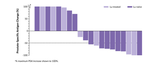 A detailed tumor dosimetry analysis for 177Lu-PSMA-617 was performed in a subgroup of 29 non-randomized patients from the VISION trial who received up to six cycles of 177Lu-PSMA-617 (7.4 GBq every six weeks) in combination with standard of care (SoC).62 Single-photon emission computed tomography (SPECT)/CT scans were used to assess tumor uptake and calculate radiation-absorbed doses over time. Data from 60 delineated prostate cancer lesions were analyzed across cycles 1–6 in 18 patients with evaluable tumors in cycles 2–6. The mean absorbed dose across all tumors declined from 7.9 Gy/GBq in cycle 1 to 1.6 Gy/GBq by cycle 6, indicating a progressive reduction in radiation delivery with successive cycles. Specifically, mean absorbed doses for bone metastases decreased from 6.4 Gy/GBq to 1.3 Gy/GBq, while doses for lymphatic metastases declined from 11 Gy/GBq to 3.2 Gy/GBq. Across the six cycles, patients received a median cumulative tumor-absorbed dose of approximately 100 Gy. This trend in declining absorbed doses over time in this dosimetry substudy is consistent with the antitumor activity demonstrated by 177Lu-PSMA-617 in the VISION trial.