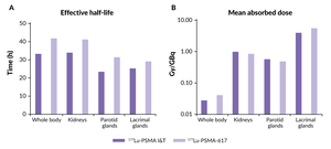 A more recent comparative dosimetry study between 177Lu-PSMA-I&T and 177Lu-PSMA-617 indicated minor differences between the two agents (Table 2). These included a shorter whole-body half-life for 177Lu-PSMA I&T than for 177Lu-PSMA-617 (35 vs 42 hours) and a significantly higher mean whole-body dose for 177Lu-PSMA-617 compared with 177Lu-PSMA I&T (p<0.00001) (Figure 4).60 Results also showed that the renal dose was significantly lower for 177Lu-PSMA-617 than for 177Lu-PSMA I&T (p=0.0015), while parotid gland doses were comparable (p=0.27). Tumor metastases exhibited higher initial uptake with 177Lu-PSMA I&T versus 177Lu-PSMA-617 but had a shorter tumor half-life (p<0.00001). Despite these differences, mean absorbed tumor doses were comparable between the two molecules (p=0.96).