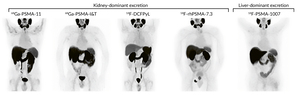 To overcome these logistic barriers, 18F-labeled PSMA ligands were developed, enabling scalable cyclotron production and wider availability. Among them, 18F-DCFPyL, a second-generation radiotracer, demonstrated normal tissue biodistribution patterns similar to 68Ga-PSMA-11, with comparable uptake in the kidneys and bladder, and low background activity.7 While 68Ga-PSMA-11 exhibited significantly higher uptake in the kidneys, spleen and major salivary glands, 18F-DCFPyL showed slightly greater liver uptake (Figure 1). These similarities established their interchangeability in clinical practice.7 Further comparative studies reinforced these findings. A retrospective study of 80 patients receiving 177Lu-PSMA-617 therapy found no significant differences in biodistribution or lesion uptake between the two tracers, although 18F-DCFPyL demonstrated higher uptake in visceral metastases.8 Based on findings from the phase III OSPREY and CONDOR trials,9,10 18F-DCFPyL is currently approved by Swissmedic, the European Medicines Agency (EMA) and FDA for positron emission tomography (PET) imaging of PSMA-positive lesions in men with prostate cancer.11–13