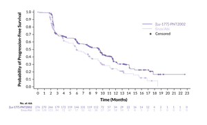 In a clinical setting, 177Lu-PSMA-I&T has been assessed in the phase III SPLASH trial, demonstrating efficacy and safety in patients with metastatic castration-resistant prostate cancer (mCRPC) progressing on an androgen receptor pathway inhibitor (ARPI) (Table 2).51,52 In this study, 412 patients with PSMA-expressing mCRPC were randomized 2:1 to receive either 177Lu-PSMA-I&T (6.8 GBq every eight weeks for up to four cycles) or an ARPI switch (abiraterone/enzalutamide). The trial met its primary endpoint, showing a median radiographic progression-free survival (rPFS) of 9.5 months with 177Lu-PSMA-I&T compared with 6.0 months with ARPI (HR: 0.71 [95% CI: 0.55–0.92]; p=0.0088) (Figure 3). This benefit was maintained across key prespecified subgroups. Furthermore, 38.1% of patients in the 177Lu-PSMA-I&T arm achieved an overall response, compared with 12.0% of patients in the ARPI arm (p=0.0021), with a median duration of response (DoR) of 9.4 months versus 7.3 months, respectively. A PSA decline of ≥50% was observed in 35.7% of patients treated with 177Lu-PSMA-I&T and 14.6% of those treated with ARPI.