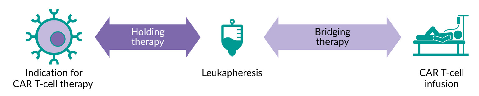 Bridging therapy specifically refers to interventions administered after lymphocyte apheresis and before the start of lymphodepleting chemotherapy (Figure 1).22 It is conceptually different from “holding therapy,” which may be used between the decision to refer a patient for CAR T-cell therapy and the collection of lymphocytes. The primary objectives of bridging therapy are not to induce remission but to control disease symptoms, preserve performance status, prevent clinical deterioration, and ultimately keep the patient eligible for lymphodepleting chemotherapy and subsequent CAR T-cell infusion. Patients who do not respond to bridging therapy can still benefit from CAR T-cell therapy and should proceed to infusion as long as they remain fit.