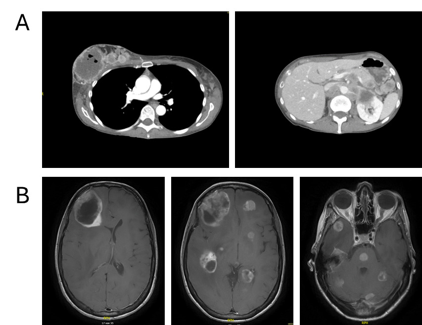 During ongoing treatment, exulceration of the right breast primary tumor developed, indicating an early sign of further disease progression. Initially, it was managed conservatively with oral amoxicillin plus clavulanic acid and referred to specialized wound care. In May 2025, after four cycles of treatment, contrast-enhanced CT and cerebral MRI revealed disease progression involving systemic and intracranial sites (Figures 3C and 3D). Concurrently, thrombosis of the left external iliac vein and new segmental pulmonary emboli in the left lower lobe were detected and therapeutic anticoagulation with apixaban was initiated. Given the radiologic progression on paclitaxel plus pembrolizumab, carboplatin monotherapy was started as an interim measure while reimbursement approval for targeted therapy was pending. However, chemotherapy was discontinued after a single administration at the patient’s request.