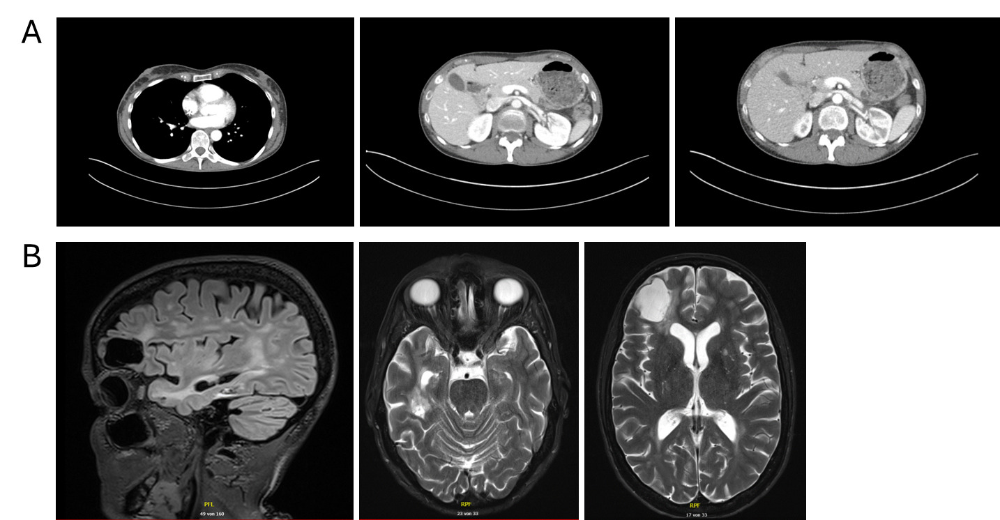 Emergency hospitalization was necessitated due to a rapid deterioration of the patient’s general condition and significant neurological deficits, specifically characterized by somnolence, disorientation and a loss of decisional capacity. Contrast-enhanced CT of the neurocranium revealed multiple (at least 12) supra- and infratentorial intracranial lesions, some partially cystic, associated with extensive perifocal edema, significant mass effect and a leftward midline shift of up to 1.1 cm, with subfalcine and incipient uncal herniation. A metastasis-suspicious left parietal osseous lesion with epidural and subgaleal extension was also identified. Subsequent magnetic resonance imaging (MRI) confirmed extensive cerebral involvement with more than 20 intradural metastases in the frontal and temporal lobes, cerebellum, basal ganglia and pons (Figure 2B). Additional metastatic sites included the left parietal calvarium with extraosseous extension, as well as in the right parotid gland and right masticator space.