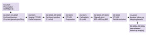 A 55-year-old woman presented in February 2025 with severe postprandial lower abdominal pain and a painful, suppurating lesion in the right breast. A right breast mass had been known since May 2024. The clinical course and treatment timeline are summarized in Figure 1.