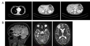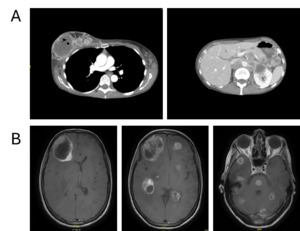 Follow-up in March 2025 showed a marked treatment response after two cycles, with significant regression of intracranial metastases on brain MRI, including resolution of midline shift and cerebral edema, as well as pronounced regression of nodal and visceral disease on contrast-enhanced CT of the thorax and abdomen (Figures 3A and 3B). No new metastatic lesions were identified, consistent with substantial partial remission.