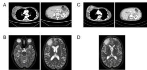 Restaging in September 2025 with contrast-enhanced CT of the thorax and abdomen and contrast-enhanced MRI of the brain demonstrated partial remission, with regression of systemic and intracranial disease and no new metastatic lesions (Figure 4). Therapeutic anticoagulation with apixaban was continued without any new thromboembolic events.