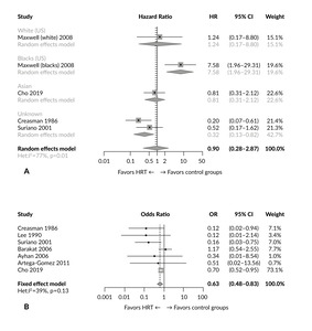 Several systematic reviews aimed to evaluate the safety and effectiveness of HRT in women treated for endometrial cancer. Edey et al.27 identified GOG 13724 as the only randomized controlled trial that met the inclusion criteria for assessing HRT in this patient population, based on searches of the Cochrane Register of Controlled Trials, MEDLINE and Embase. Di Donato et al. screened 1,332 abstracts and included seven eligible studies in the analysis, among them four retrospective series, one prospective study, one randomized controlled trial and one population-based study.28 Overall, across predominantly stage I–II cohorts, HRT use was not associated with a statistically significant increase in recurrence compared with controls. An important limitation was selection bias, as HRT was preferentially prescribed to younger women with low-risk, early-stage disease. A more recent meta-analysis included both randomized and observational studies, comprising 10 papers published between 1986 and 2021.29 Of these, two reported data from randomized clinical trials, five were non-randomized cohort studies and three were case-control studies.24–26,30–34 The total sample included 7,944 patients, including 1,801 treated with HRT and 6,015 controls. Based on four studies that allowed time-dependent analysis, the study indicated no significant difference in disease-free survival between women treated with HRT and those not treated (pooled HR: 0.90 (95% CI: 0.28–2.87). However, significantly increased risk of recurrence was reported among Black American women treated with continuous estrogen (HR: 7.58 (95% CI: 1.96–29.31),29 confirming the findings of the GOG 137 trial.25 A pooled odds ratio (OR) of 0.63 (95% CI: 0.48–0.83) across all included studies indicated a significantly reduced risk of recurrence among endometrial cancer survivors treated with HRT. Combined estrogen and progestin therapy, particularly when administered in cyclic regimens, appeared to be the most favorable for reducing the recurrence risk. The results of this study are summarized in Figure 1.